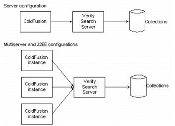 In the multiserver and J2EE configurations, multiple ColdFusion server instances all use the same Verity Search Server to access the same set of Collections.