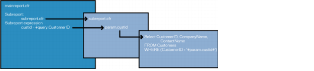 The following example shows the use of subreport parameters and the relationship between a report and a subreport:
